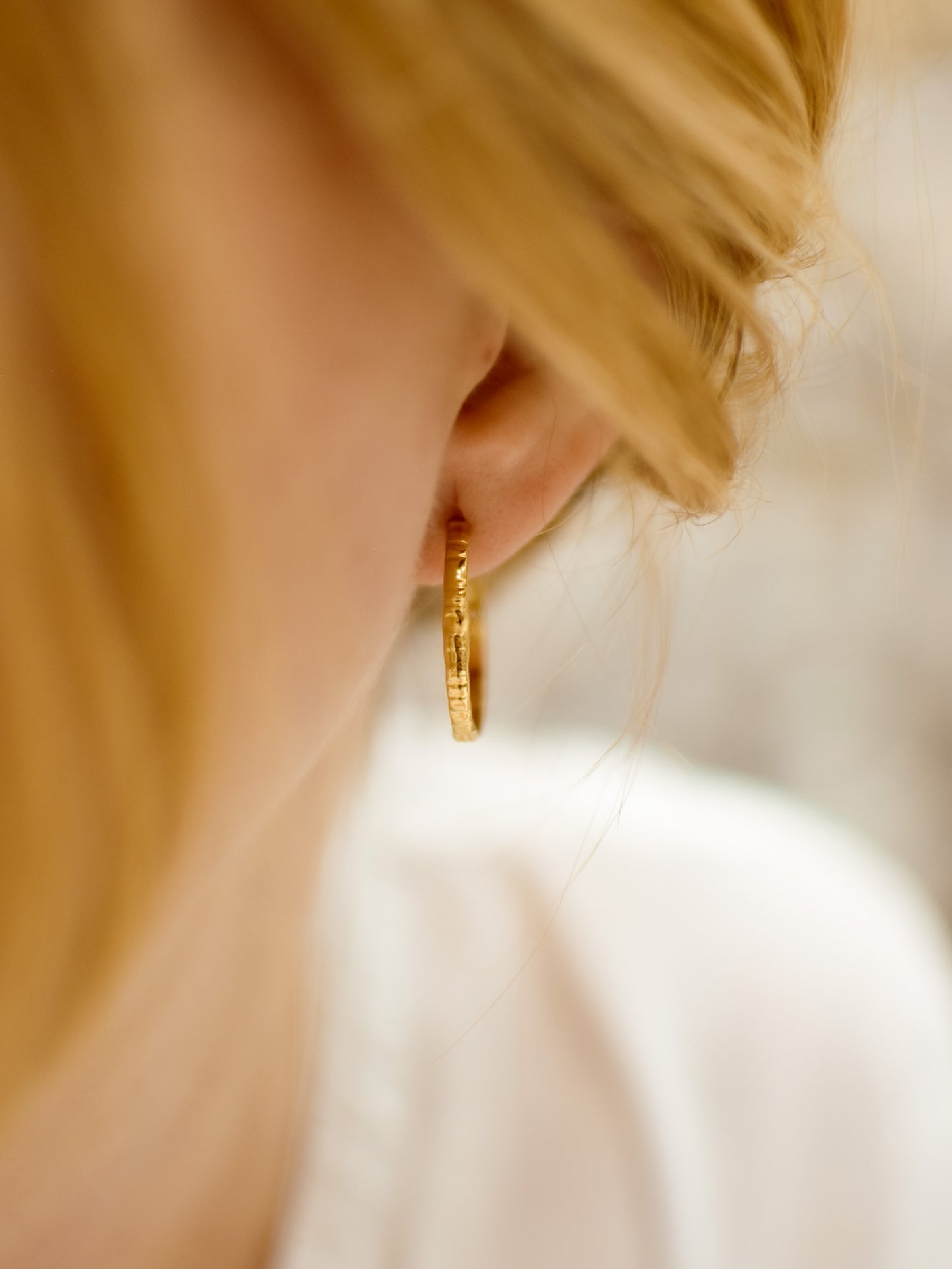 Ces créoles dorées ANEO sublimées par une surface mi-martelée mi-embossée sont faites en acier inoxydable pour une grande durabilité. Des essentiels à avoir dans votre collection!