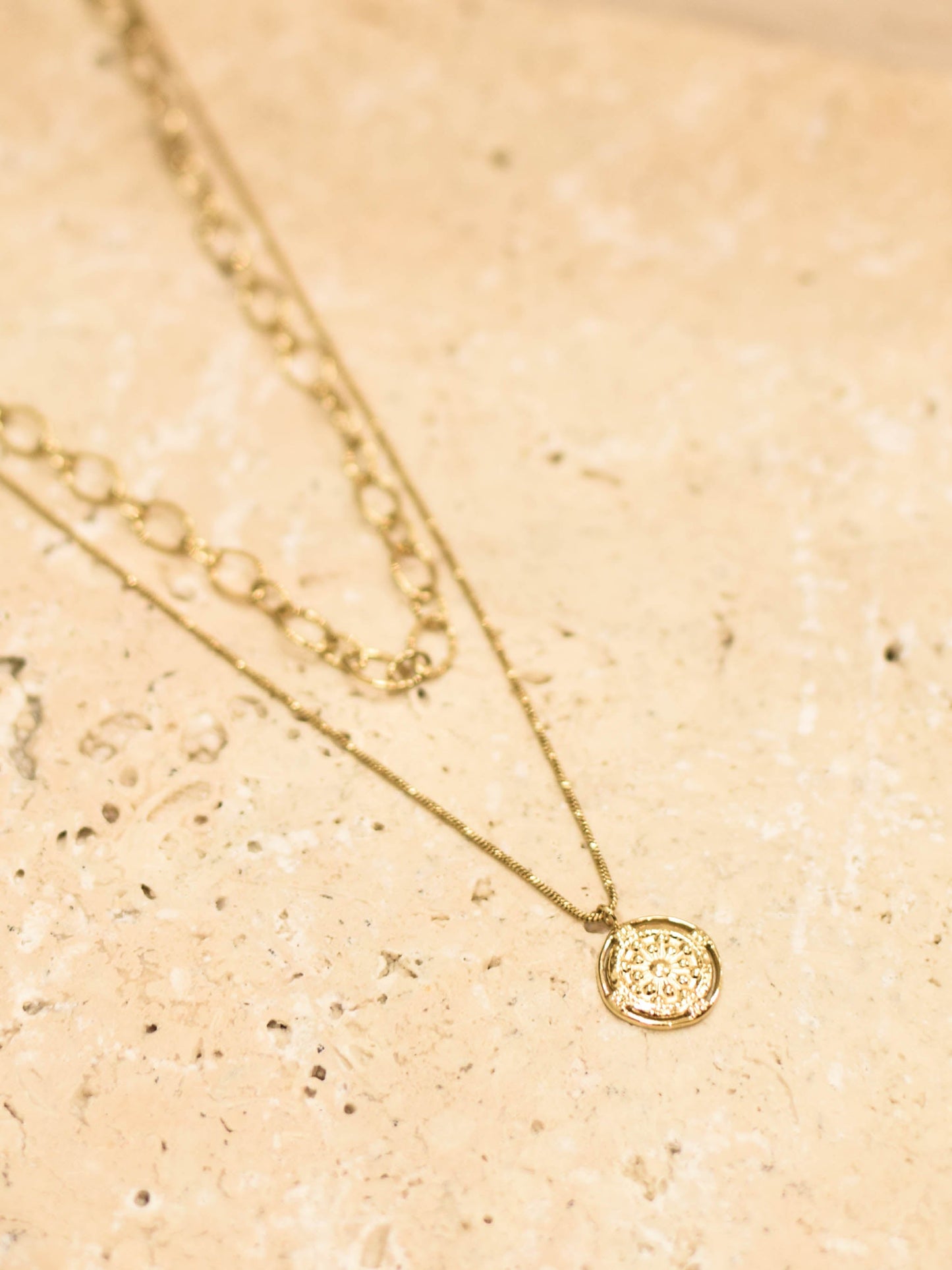 MALIA c'est l'association de 2 chaînes différentes qui se complètent parfaitement. L'une est une chaîne à maillons larges et fins et l'autre plus longue est une délicate chaîne serpent agrémentée d'un médaillon gravé. C'est le collier double rangs qui s'associe à tous les looks.